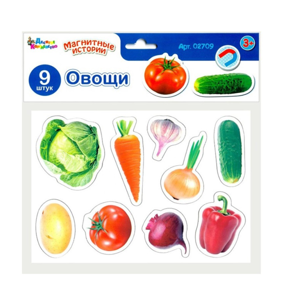 Магниты Овощи прямо с грядки очутились у малыша. Самое время познакомиться с ними. Доставайте фигурки из рамки и размещайте на дверце холодильника! Магниты Овощи, состав набора прямоугольная рамка 9 магнитов с изображением овощей Магнитный овощной салат Перечислите названия всех участников магнитных историй: капуста, морковка, чеснок, лук, огурец, картошка, помидор, свекла, перец. Назовите форму и цвет каждого овоща. Расскажите ребенку о пользе корнеплодов, о том, где и как они растут, о витаминной составляющей, которая необходима для того, чтобы малыш рос сильным и здоровым. Попросите ребенка достать каждую фигурку из рамки и поместить на магнитную доску, планшет или холодильник. Перед каждым приёмом пищи находите ингредиенты блюд и вспоминайте их имена. Чем полезен набор Ребенок изучает названия и внешний вид полезных продуктов питания. Магнитики вызывают детский интерес к корнеплодам, а значит, позволяют родителям вводить больше овощей в рацион ребенка. Передвижение фигурок полезно для развития моторики пальчиков и координации движения рук. О бренде: Десятое королевство – это отечественные игрушки для детей разного возраста, учебно-наглядные пособия для школьников и множество игр по лицензии Disney. Развивайте своего ребенка на сказочном уровне! Подружите ребенка с овощами с помощью магнитных историй! Параметры товара: магниты от 45х40 мм до 55х80 мм, рамка 210х150 мм, упаковка – пакет с картонным подвесом 240х230 мм, вес 60 г