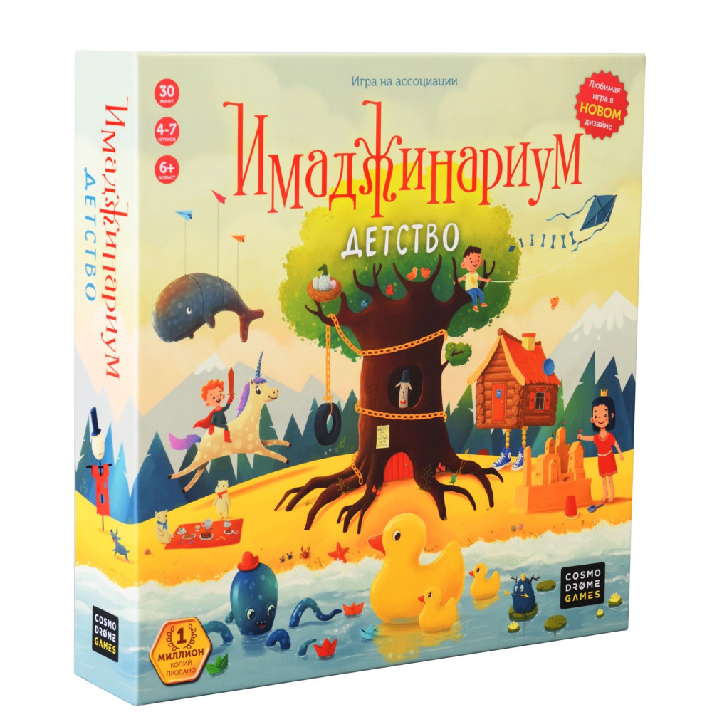 Легендарный "Имаджинариум" в новом формате - специально для детей!" Имаджинариум Детство" развивает воображение - оно поможет малышам придумывать интересные ассоциации к иллюстрациям и угадывать картинки других игроков, чтобы привести к финишу крылатого слоника.**Как играть?**Вооружитесь картами и выберите того, кто первым станет ведущим. Он предложит ассоциацию, и каждый найдет у себя подходящую картинку. Карты перемешиваются, а потом все угадывают иллюстрацию ведущего и подсчитывают очки."Имаджинариум Детство" подойдет для семейных посиделок, встреч с друзьями, вечеринок и праздников, главное - чтобы участникам было больше 6 лет. В новой версии "Имаджинариум Детство" появился удобный пластиковый ложемент с кладовыми для колод и специальным отделением для фишек. Поле стало съемным и на нём появились подсказки по подсчету очков, чтобы сделать игру ещё понятнее. А ещё на нём появились милые специальные задания для малышей и упрощённые правила.