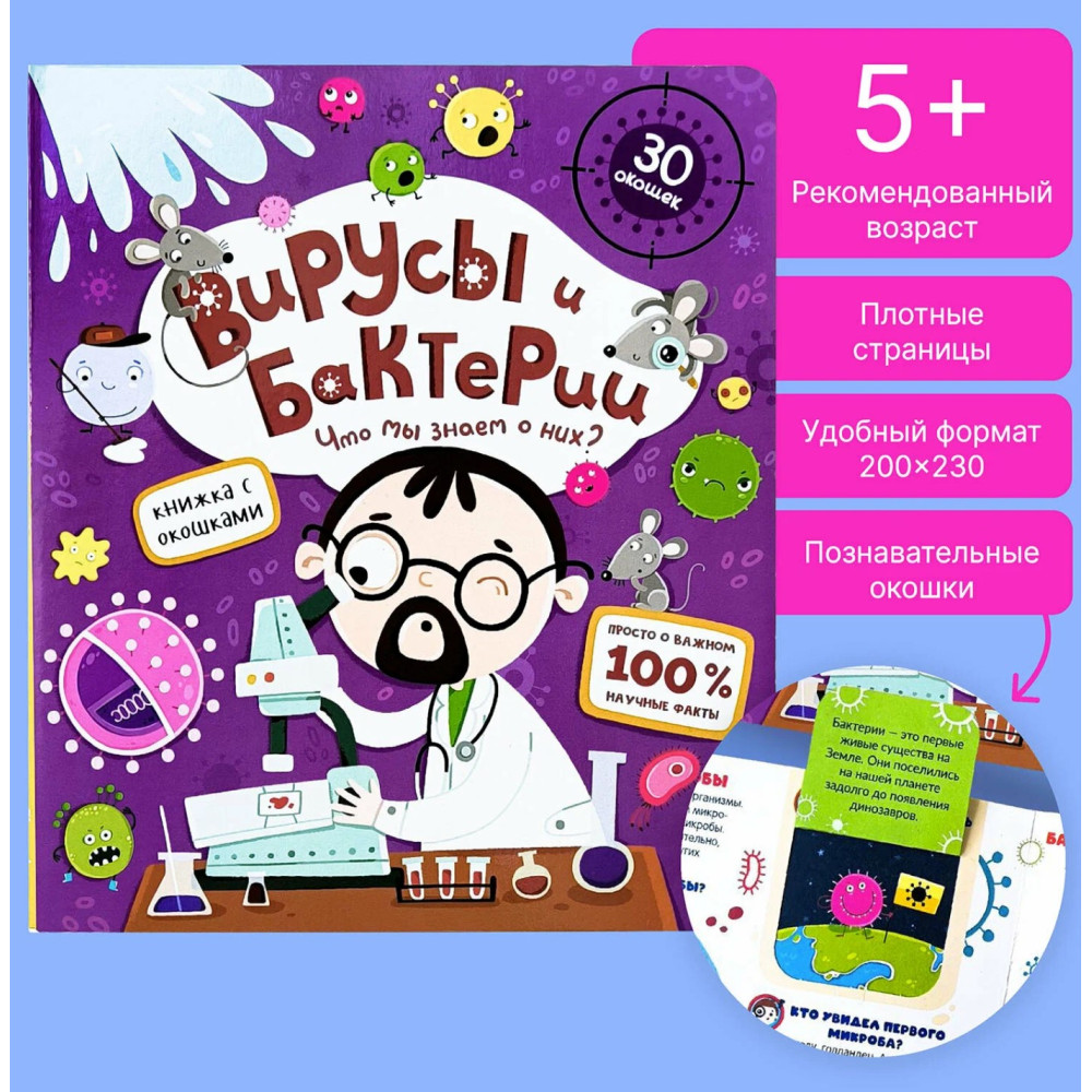 Книжка с окошками Вирусы и бактерии. Что мы о них знаем? Malamalama Энциклопедия для детей 30 окошек