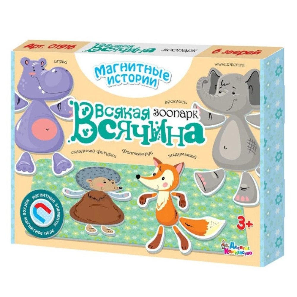 Магнитная игра "Всякая всячина Зоопарк" от "Десятого королевства" - это развивающий конструктор для детей от трех лет. Она состоит из двухстороннего мягкого магнитного поля и 40 мягких магнитных элементов, которые позволяют ребенку создавать различные комбинации и истории о животных.